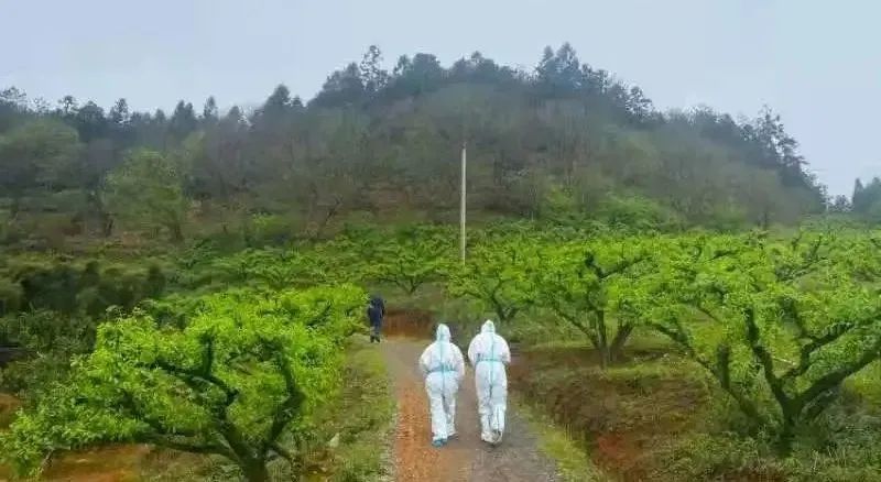 2022年春分细雨朦胧时,医护人员下乡上山给村民做核酸,村干部领路,一步一路向上,一路李子树相拥。心中信念:待到山花烂漫时,她在丛中笑。
