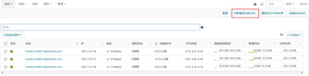 2) 主机监控:监控集群内所有主机的有关信息,包括主机目前消耗到内存,主机上运行的角色分配等,不但显示所有集群主机的汇总视图,而且能够进一步显示单个主机关键指标详细视图。