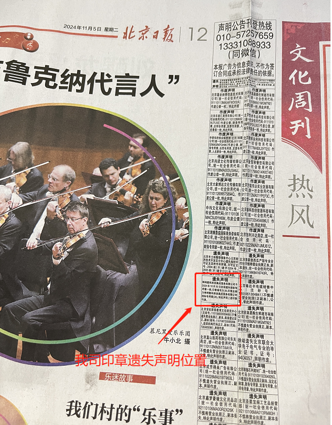 以上声明内容已在2024年11月5日期的北京日报上同步刊登(下已附图),如有捡拾到上述印章的,可联系我司接口人刘翠珍(13522114452)予以归还!望周知!